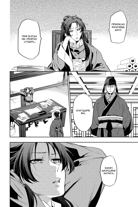 Маомао за особые заслуги принимают на службу в Нефритовый дворец, и теперь она день ото дня пробует на яд кушанья наложницы Гёкуё. Казалось бы, положенный срок она проведет без приключений, но вдруг на пиршестве, устроенном в императорском саду, пытаются отравить нравственную наложницу Лишу! Пусть она совсем молода и едва ли может соперничать с другими наложницами высокого ранга, а все же против нее явно строят козни. Даже служанки обратились против бедняжки! Вмешается ли Маомао?